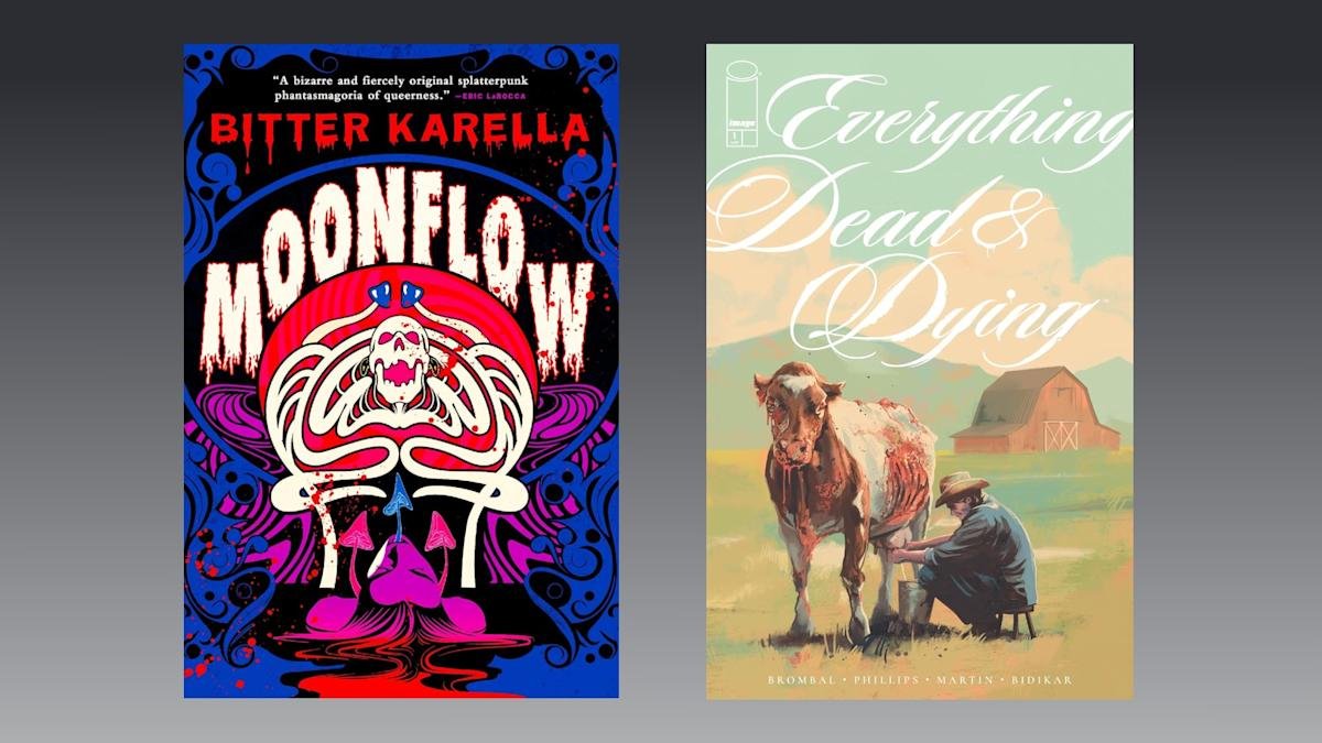 Moonflow is, as author Bitter Karella described it in a recent interview, “Psychedelic trans cosmic fungal splatterpunk.” It follows Sarah, a trans woman who grows and sells trippy mushrooms, on a desperate search for a mushroom known as the King’s Breakfast. It’s the type of excursion that seems doomed from the start, as the King’s Breakfast is only found in a forest best known for being a place people do not return from, and predictably, things start going off the rails almost immediately. The forest is haunted and seemingly in a constant state of change, there’s a TERFy lesbian off-grid cult that’s engaged in some deeply bizarre activities and poor Sarah is… just doing her best (she is painfully relatable).