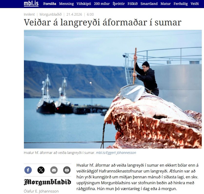 The Icelandic media are reporting that the single whaling firm on Iceland plans to resume hunts for Fin Whales this year. Government has announced that the quota would be 150 Fin Whales this year (less than last year, but then none of it was used last year).