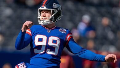 New York Giants place kicker Jude McAtamney (99) kicks a field goal during warm ups prior to the start of…